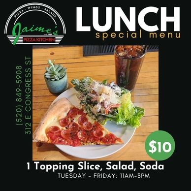 Join us for lunch and enjoy our lunch special: a slice, any 1 topping, a side salad and fountain beverage for $10